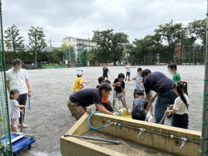 水鉄砲で遊んだがゆえ、なかにはビチャビチャになる子供も。夏休み前に楽しい思い出ができたのではないでしょうか?